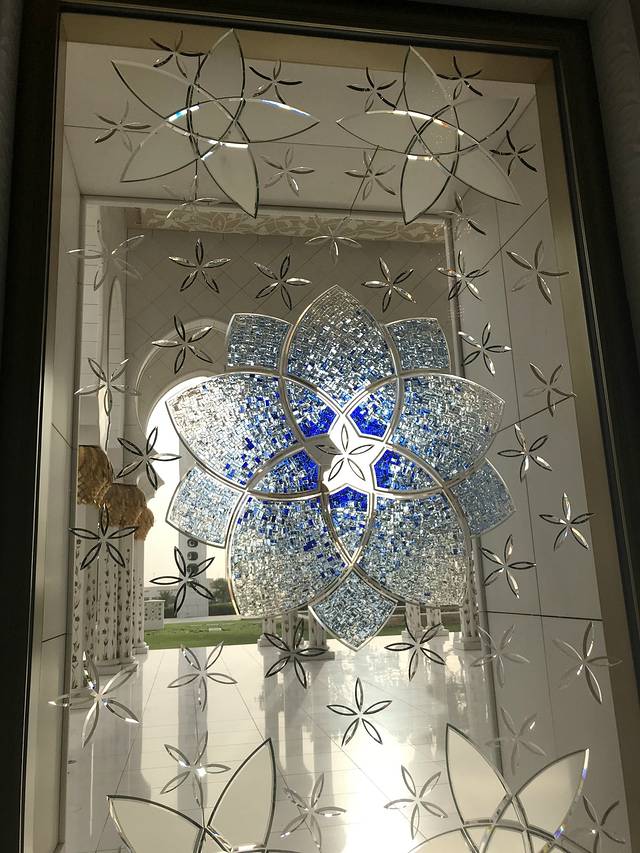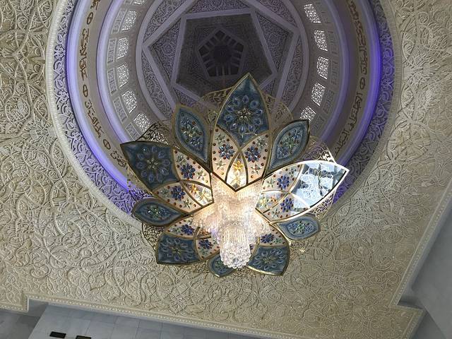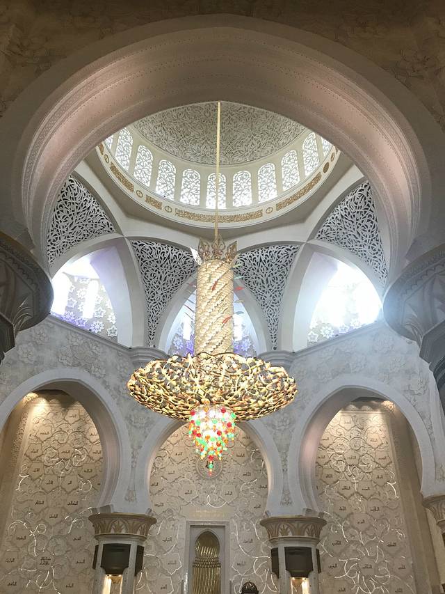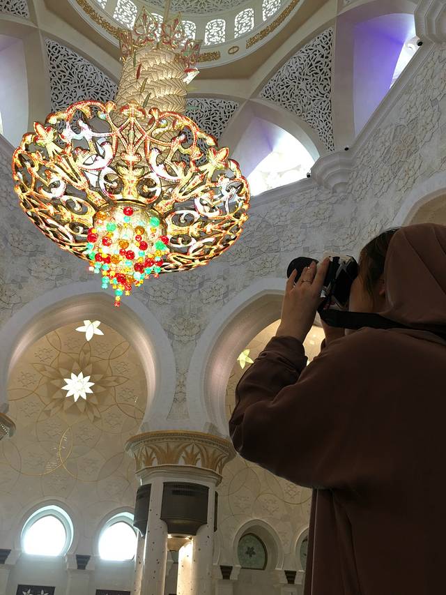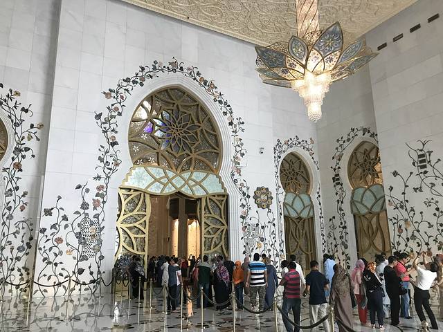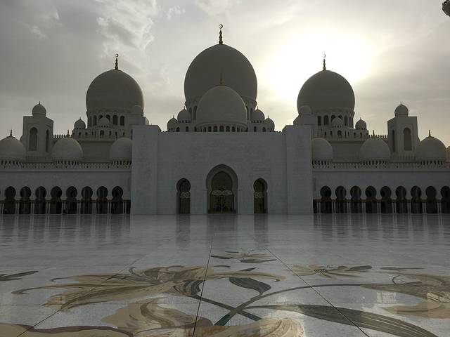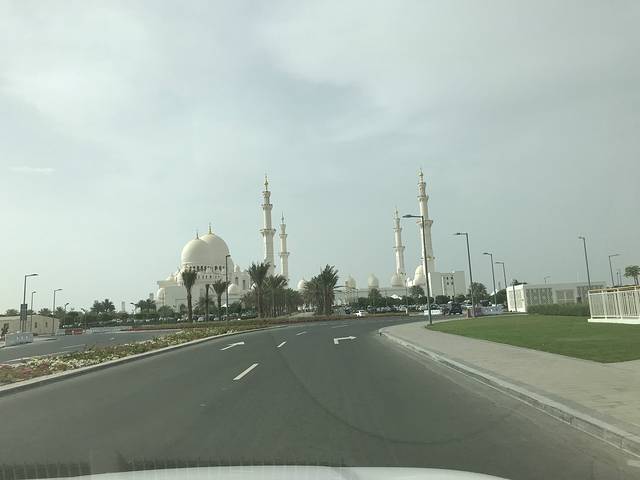 经过一个多小时的高速狂飙,我们开到了位于阿布扎比的谢赫扎耶德大清真寺,想想如果是蓝天白云绿树搭配着这个雪白的清真寺,画面会更加美丽吧。