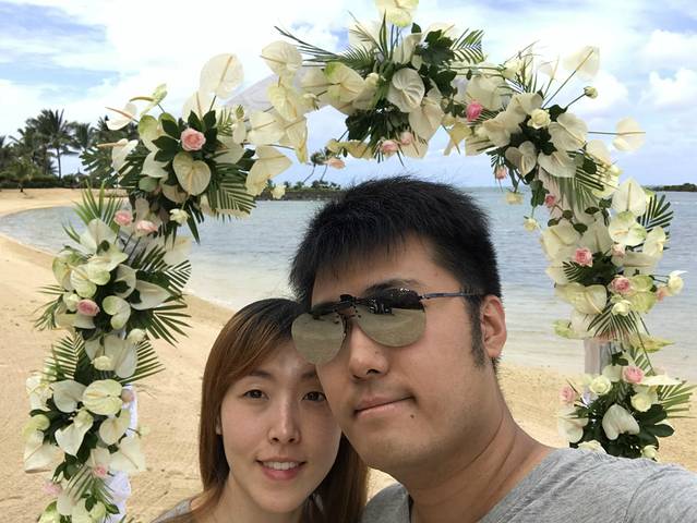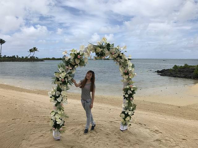 海边正赶上前一天有人办婚礼,花门还没有收,所以借光合影啦
