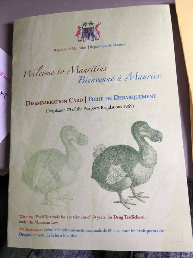 这是印着渡渡鸟的入境卡,已经灭绝了,毛里求斯的国鸟,希望大家可以保护环境和动物,不要再让地球上的其他物种灭绝。