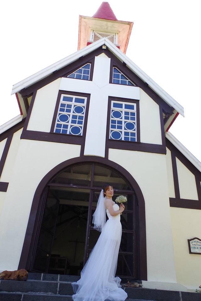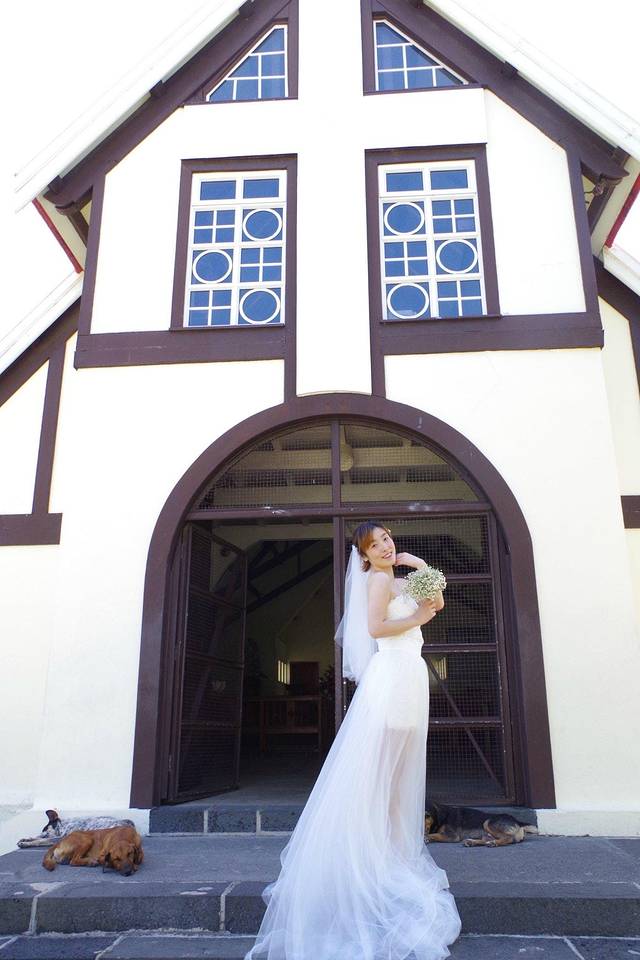 教堂这边的游客不是很多,拍照时可以很轻松做到画面内没有别人的,但是有不少只狗狗,都趴在阴凉地乘凉,大家都很友好,没有人会去轰他们,希望我们的城市也可以这么包容小动物。我选的婚纱是可以拆卸的裙摆,因为轻便所以在阳光直射时候有一些透腿,效果欠佳,建议想要拍婚纱的小姐姐们选择正经的连身婚纱吧,不要图方便买我这种拆卸的。