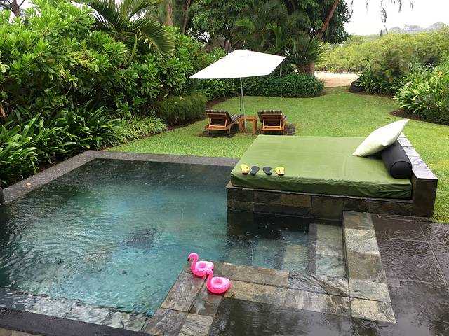 自己房间都会有一个小泳池,从躺椅前边走出去,是一片海湾,浮潜会看到小鱼,不过鱼不多