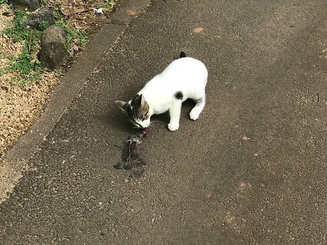 在吃早餐的路上,看见了一只被车压死的老鼠尸体,然后接着往前走又遇见了一只流浪小猫,于是引领小猫走到老鼠面前,没想到居然毫无迟疑地狼吞虎咽的给吃了。