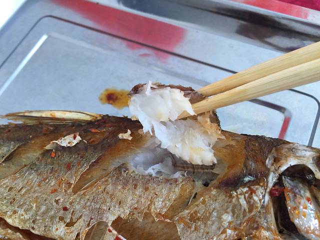 出了大峡谷到处有烤鱼摊。实际上是炸鱼。哈哈 新鲜炸的还不错哦。这种翘嘴鱼肉鲜嫩,但是刺也多,吃的时候要小心。