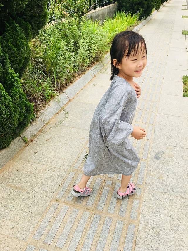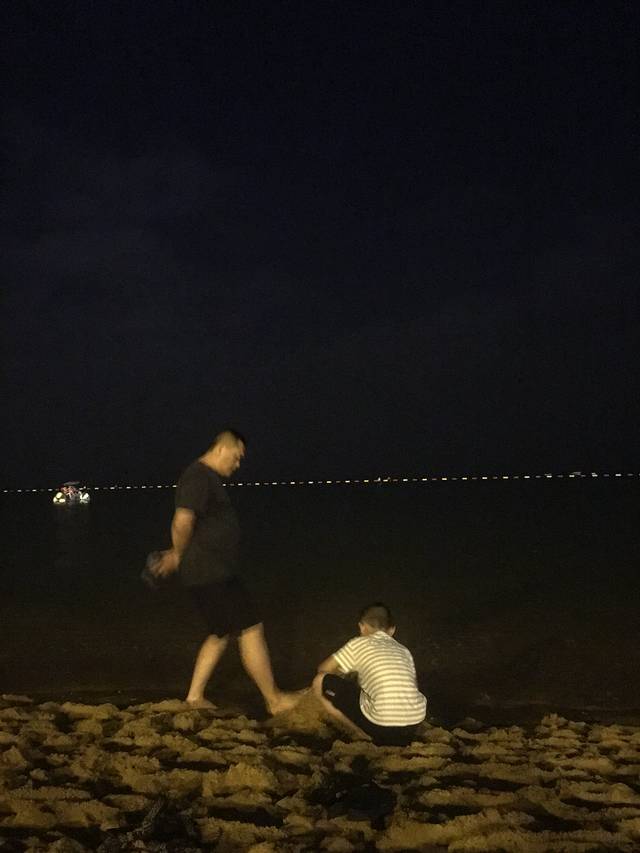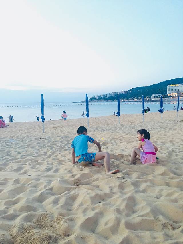 晚上我们从酒店步行去海水浴场,孩子们玩沙子