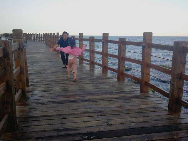 下午渔家老板给联系好包车,五个景点240,负责接送,林海、峰山、月牙湾,九丈崖,望夫礁,我们只去了林海、月牙湾、九丈崖,林海不错,一直都是林海的美景,我们一边走一边逛,一点都不累,这里的石头也特别好,还有玻璃栈道,孩子们栈道上玩的很开心。这里最著名的就是黄、渤海分界线,两边海水的颜色不一样,而且流动的方向也不一样,一边浪大,一边平静,也是奇观。
