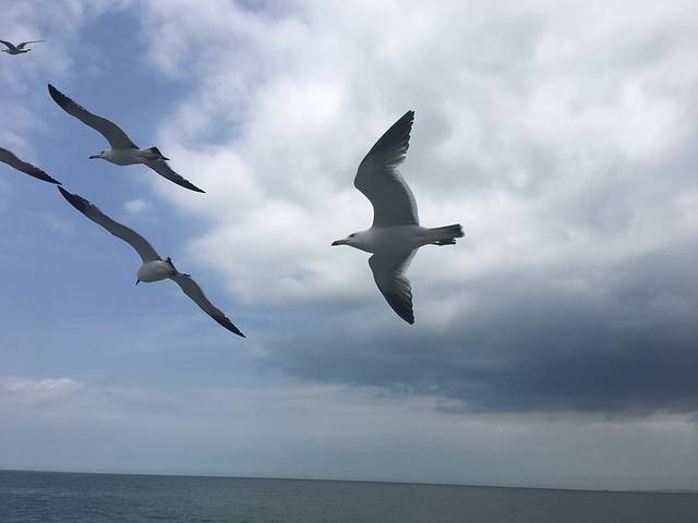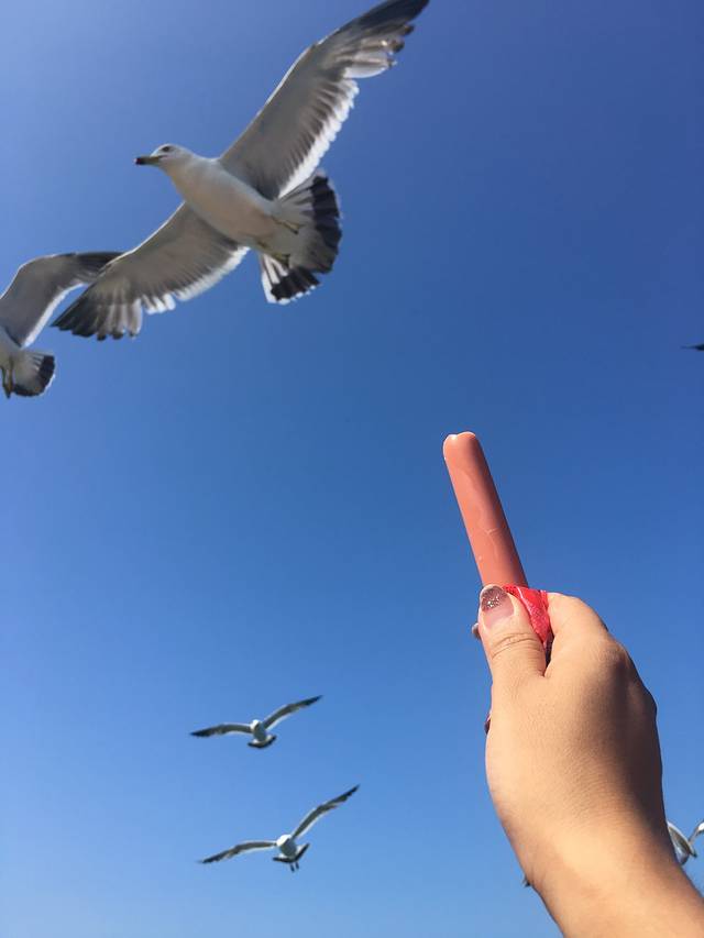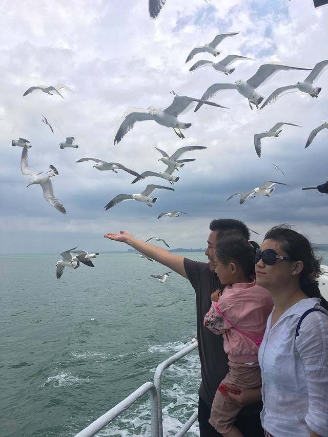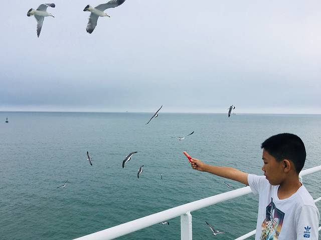 第四天早上退了房,我们在烟台还了车,坐大巴去了蓬莱汽车站,成人每位27,然后又打车25去了蓬莱港,上了一艘特别破的船,一致认为是一辆偷渡的船,实在是太破了,船上10元4根火腿,可以喂海鸥,还是蛮好玩的,但是后来知道喂海鸥哪里都可以