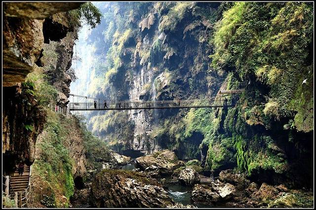 ·进入景区大门,乘坐观光电梯下到谷底,可沿着河谷两边的步道前行。