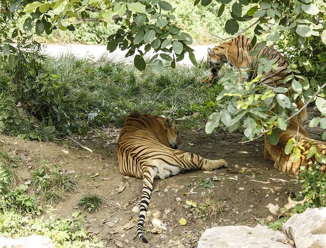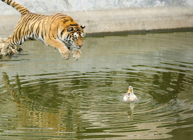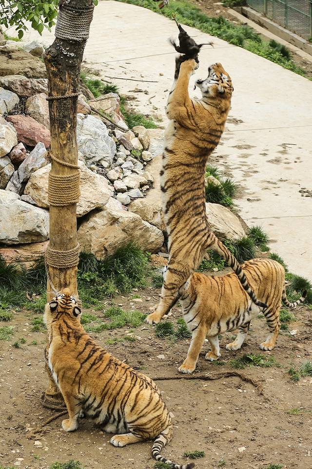 据说,这里的老虎平时只喂半饱,游客可以买活鸡、活鸭、牛肉来投喂,以此来调动老虎的积极性,供游人观赏拍摄。