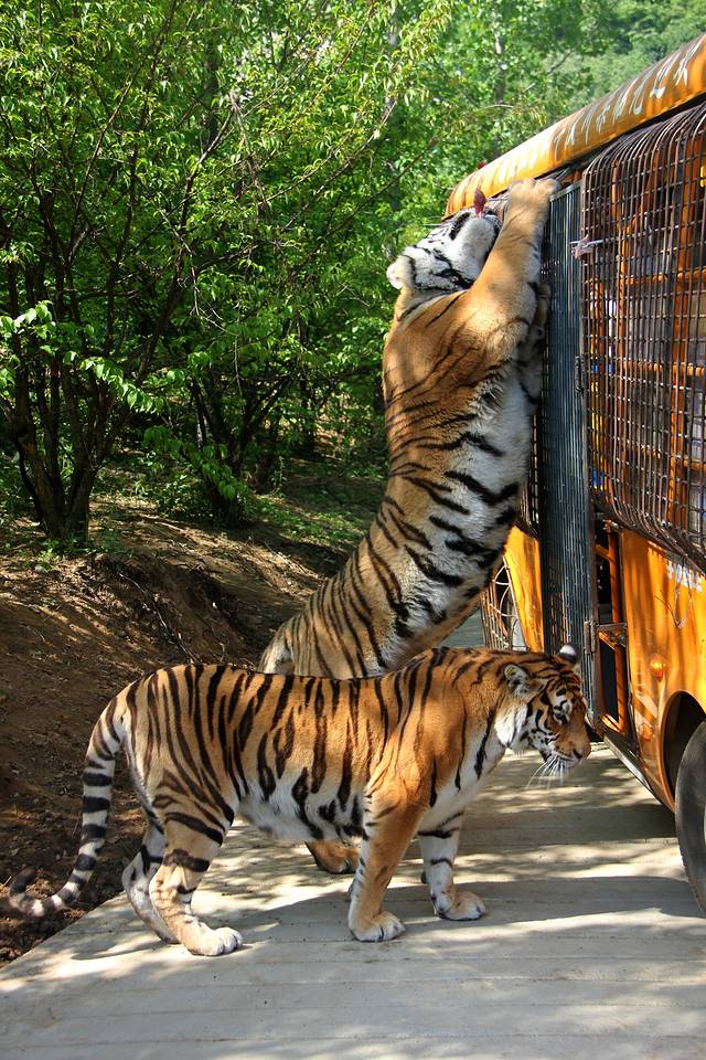 前往东北虎散养区,需要乘坐动物园专用的“观虎车”,就是那种从头武装到脚安装了铁笼子的箱式客车。