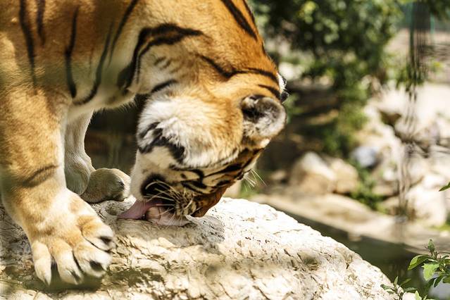 或许是早已厌倦了这种日日观看人类的场面,也或者是有着把控一切的强大内心,那老虎折身一跃跳上岩石,躺下来安心享用起它的午餐来。