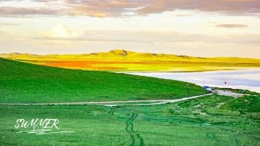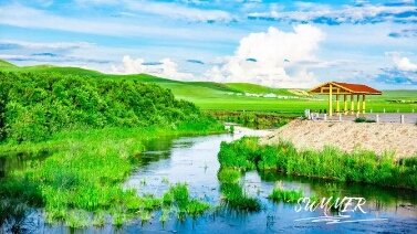 茂密的草儿、星星点点的野花、蜿蜒的河流、成群的牛羊、一望无际的湖泊……微风拂动,惬意非常。