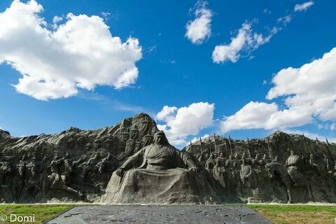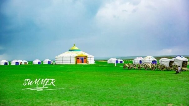 盛夏时节,一片绿色的海洋上,盛开着芍药花和山丹花,片片白云在无尽的蓝天中飘游,牧人策马,牛羊游动,加上蒙古包缕缕的炊烟与缓缓行驶的勒勒车……完全重现风吹草低见牛羊的美景。