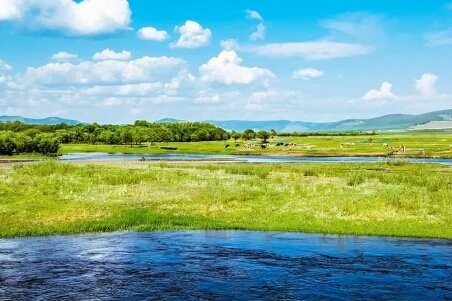 莫日格勒河蜿蜒曲折,河畔鲜花盛开,牛羊成群。