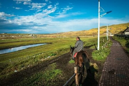 道路两旁开阔的草原,成群的牛羊,零落的蒙古包,来这里吹吹风,看着波光粼粼的湖面,十分惬意。