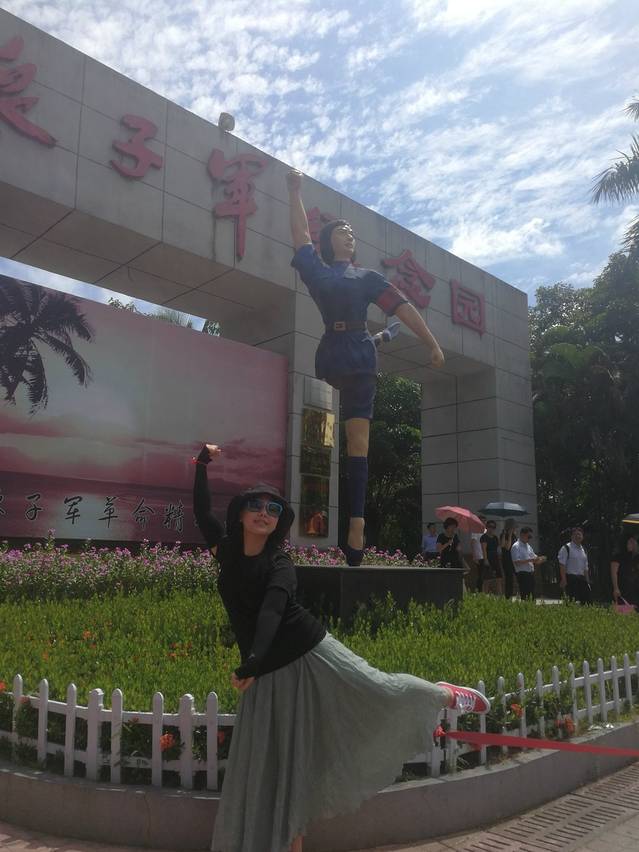 入园门前有个红色娘子军芭蕾舞雕塑,旁边有人租道具,衣服,可以去租了穿上拍照。