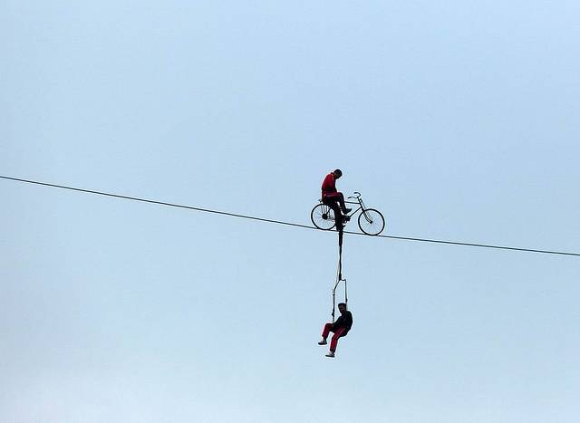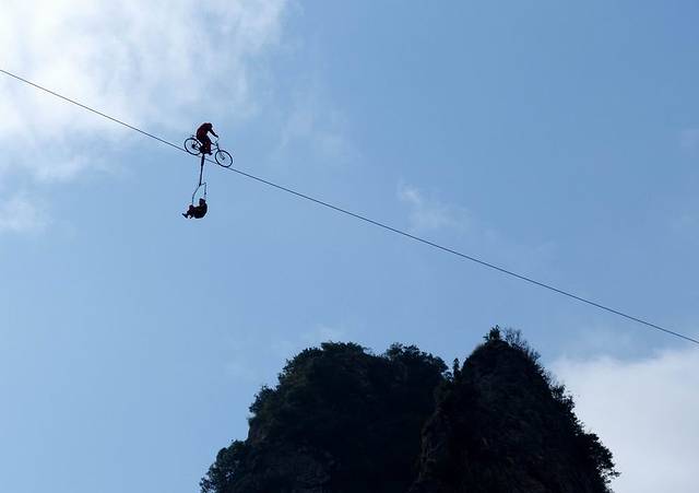 这是演员在200多米的高空,表演钢索骑自行车。