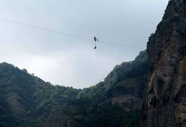 我们当天观看的是下午三点的灵岩飞渡表演。图为演员在钢索上的自行车表演。