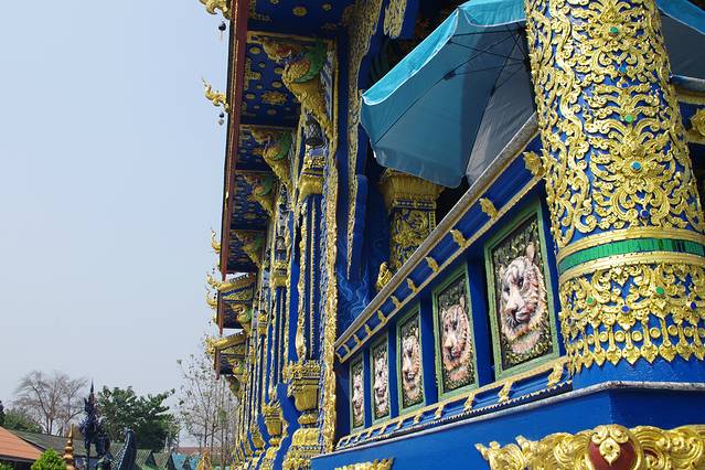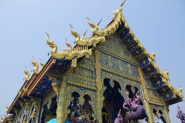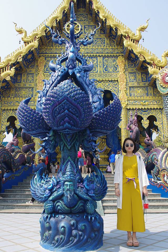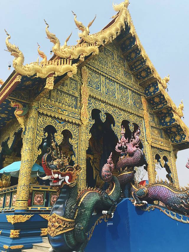 清莱的蓝庙,庙如其名,整座庙的基调为蓝,规模很小,十几分钟就能全部逛完,设计者为白庙设计者的徒弟,主殿可以进去,但不能拍照,因为是热门景点线,团客比较多,拍照要抓时机。