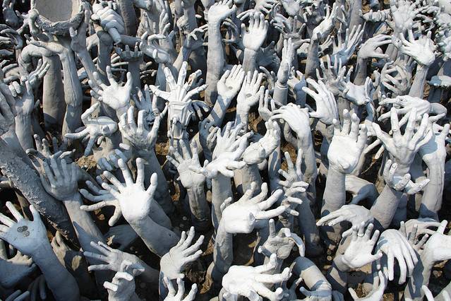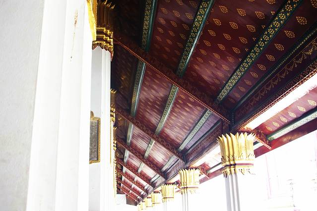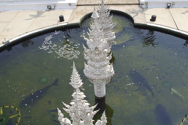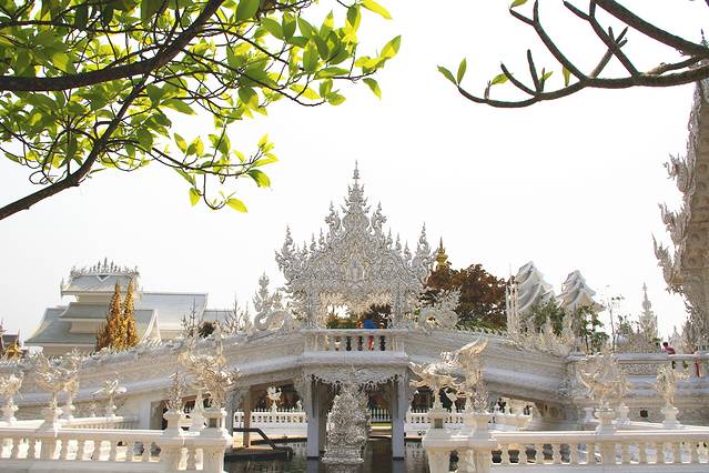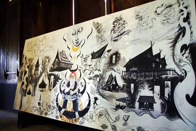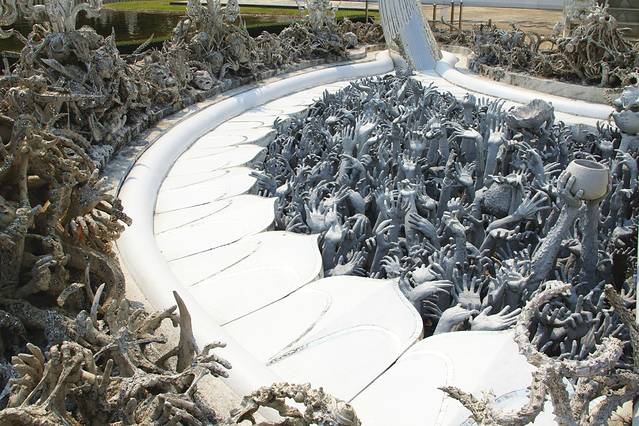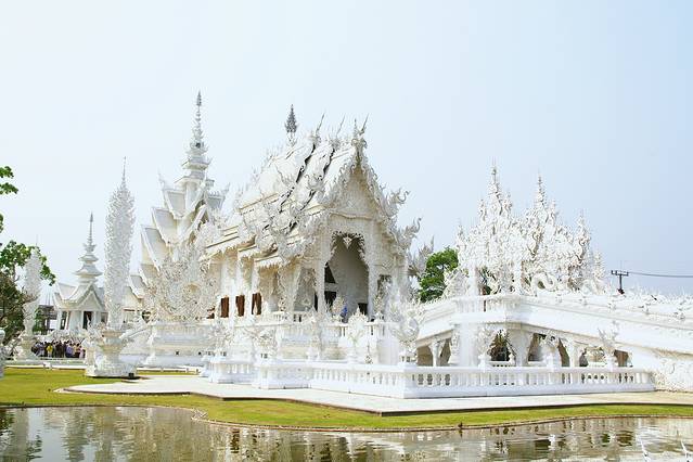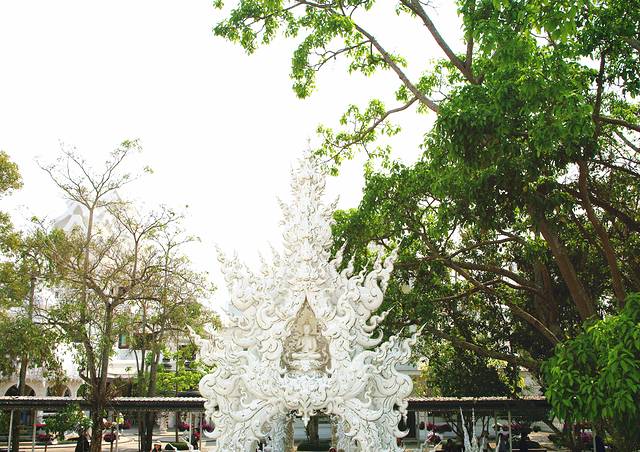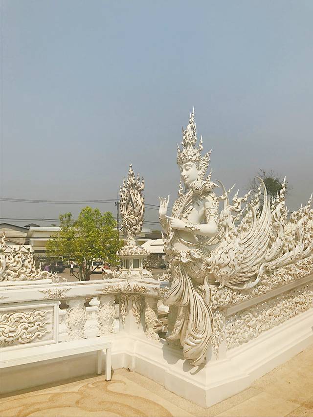 如果黑庙的注解是地狱那白庙便是天堂,和泰国其他寺庙一贯的金碧辉煌不一样,灵光寺就如它的着色一般圣洁耀眼仿佛能净化一切,它是泰国著名建筑师/画家Chalermchai Kositpipat献给家乡的礼物,寺庙通体洁白,用银色玻璃做镶嵌,主殿内手绘的巨幅佛像壁画精美绝伦。整座寺庙无论是宏观还是细节,都令人惊艳。