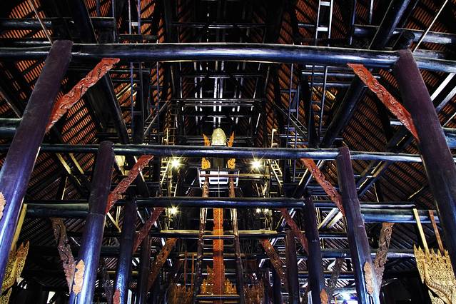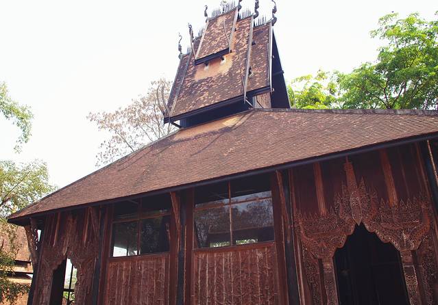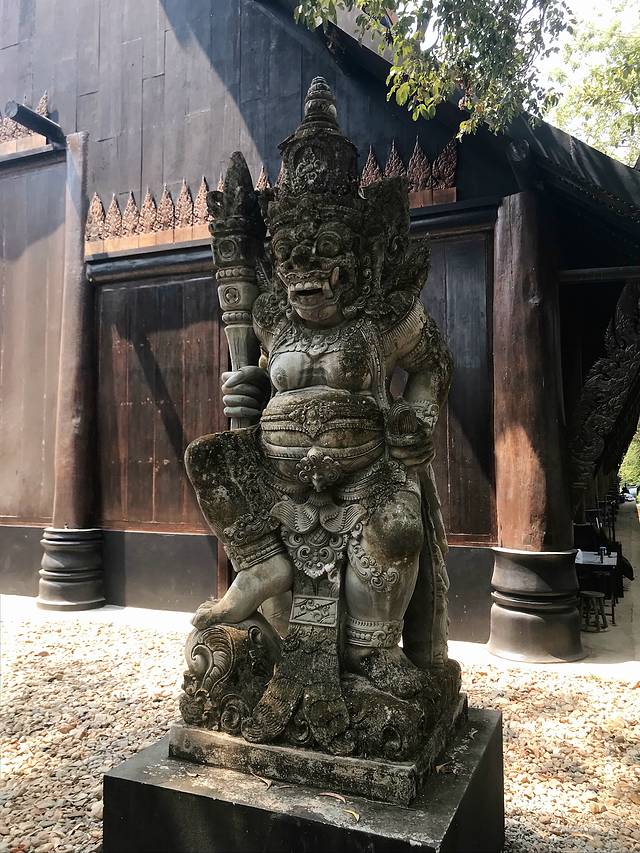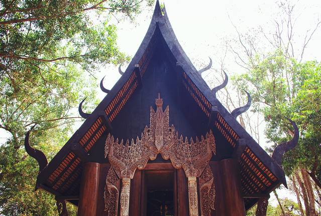 白庙的对立地狱黑庙,事实上它并不是庙,而是泰国艺术家Thawan Duchanee建造的私人博物馆,博物馆整体建筑用了暗黑调,搜集罗列了大量关于死亡的展品,兽骨、兽皮、原始的猎杀工具、祭祀品、水牛角的巨型座椅、魔鬼浮雕、吊在半空的动物皮做成的风铃装置等等,给足了你关于暗黑地狱的想象,个人认为还是一个值得逛的比较有意思的景点。