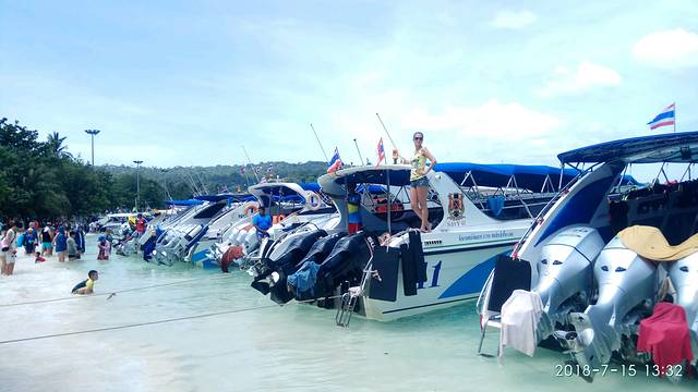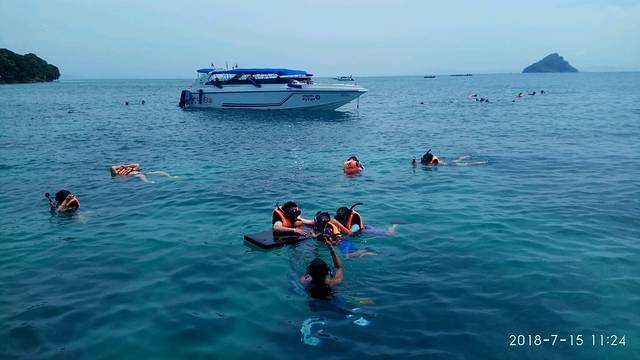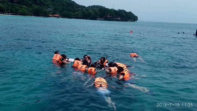 解说海上和上岛注意事项后,大家开始挑选装备,船上提供浮潜面罩,呼吸器,其他的可根据自己情况选择沙滩袜子200铢(价格和某宝差不多,底子比某宝同价位的厚些),脚蹼150铢,租潜水相机1500铢左右吧。