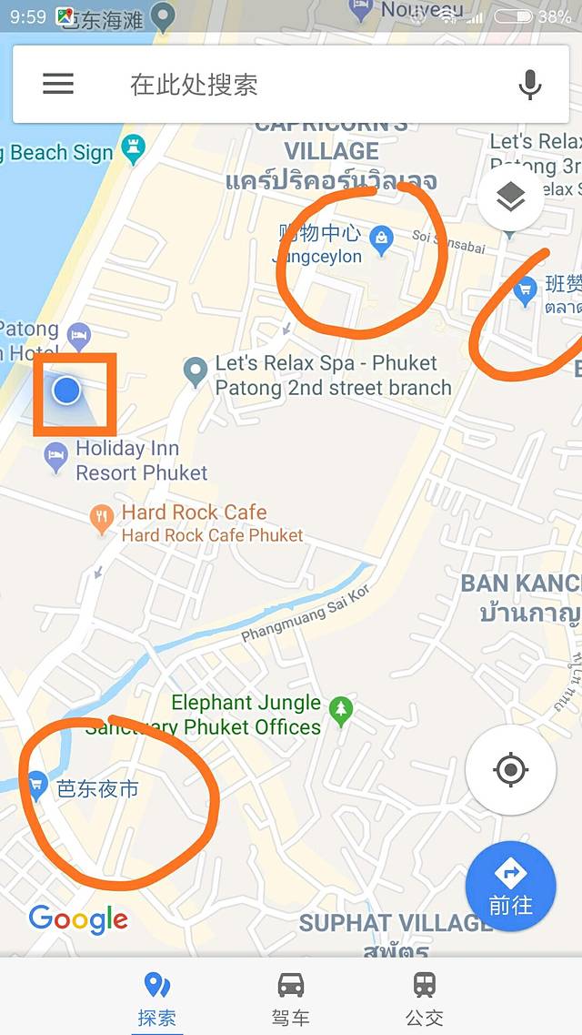 这里交通,购物,娱乐很方便,对于在住宿方面没有太高要求的年轻人来说,我还是强烈推荐的。(方块是住的地方,圆圈是江西冷,班赞,芭东夜市)