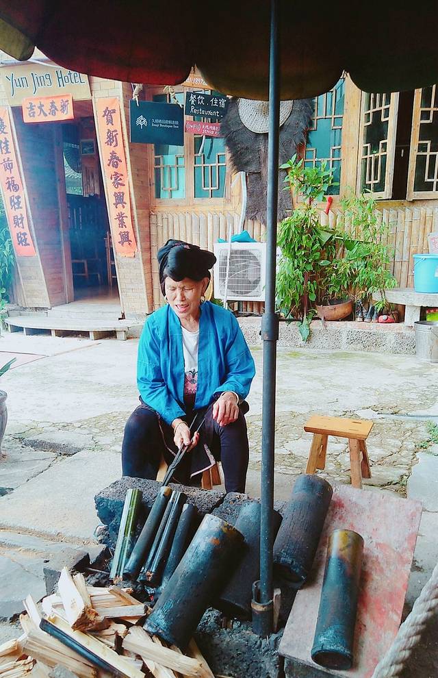 客栈老奶奶在烧竹筒饭、竹筒鸡