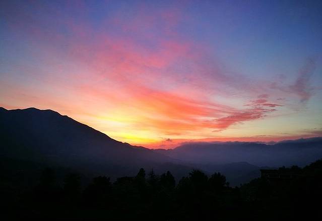 天色渐晚,远山的雾气缭绕,层叠隐现,好像一轻一重勾画出来的山水画。