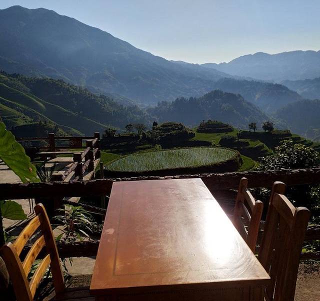 我这次订的是桂林龙胜龙脊佳美阁客栈,是之前来过的朋友推荐的,位于田头寨,门前就是七星追月观景台。田头寨是一片居中的寨子,离一号和二号观景台都比较近,有很多客栈可供选择。