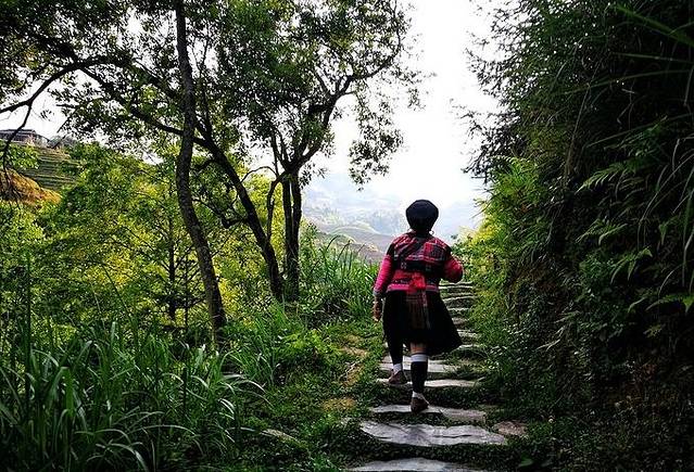 离开大寨村拾级而上,上山的时间比我想象中要长,爬的是石板路阶梯,角度都挺大的。反正一起上山的几个年轻人都已经气喘吁吁,扶着膝盖了,阿婆还在前面走得飞快,真是特别厉害。旺季的时候,阿婆一天会这样上下山十几趟。