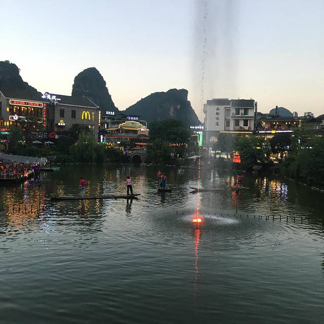 导航开车大概一个小时,同样听朋友的建议,住在西街。这次定的是阳朔西街四海酒店,像是一个民俗,在热闹的街里穿进去,里面有个小院子,种了很多花啊草啊书树啊 ,还有鱼,反正感觉挺不错的。这次把车停在了停车场,40元每天。安顿好休息了就出去吃饭逛逛啦。