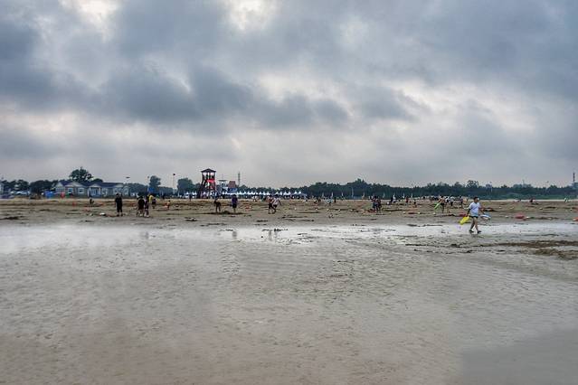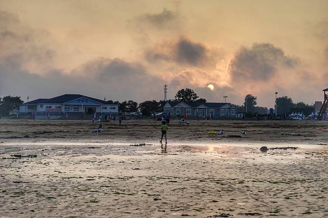 到日照吴家台村已经是傍晚,今天虽然天气并不好,雷阵雨转多云,但是没有风,据说傍晚的海边挺美的。迫不及待换上泳衣去村旁的海滩看看,才刚刚七月份这里的游客已经不少了,刚刚退潮,沙子果然很细,踩在上面湿漉漉,软绵绵,舒服极了。