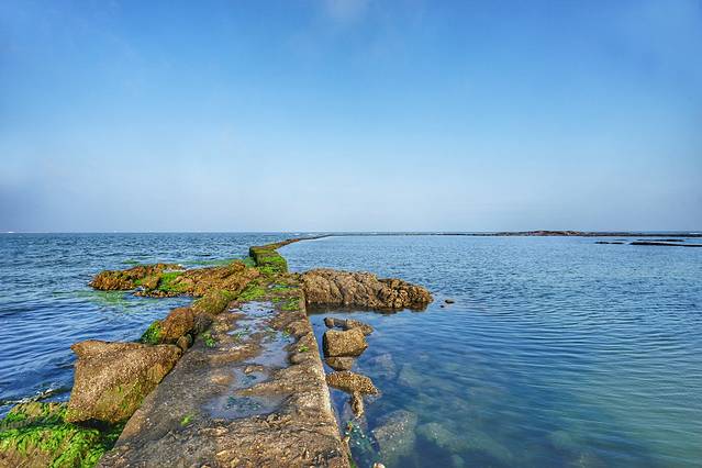 这里还有一个最特别的地方,因为原来是养殖基地,所以以礁石为依托,人为修建了堤坝,涨潮的时候看不见,退潮以后就形成了一条通往海中的环形通道。