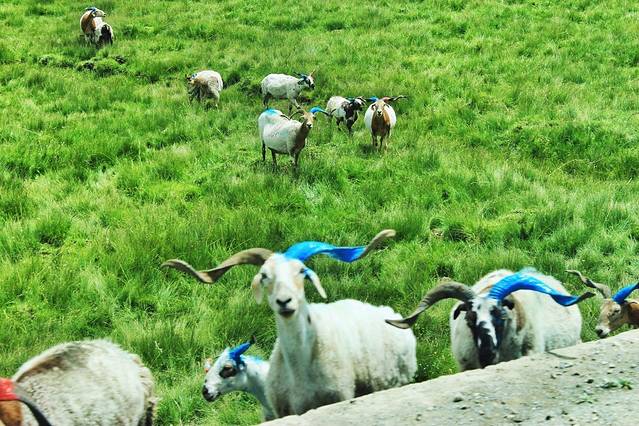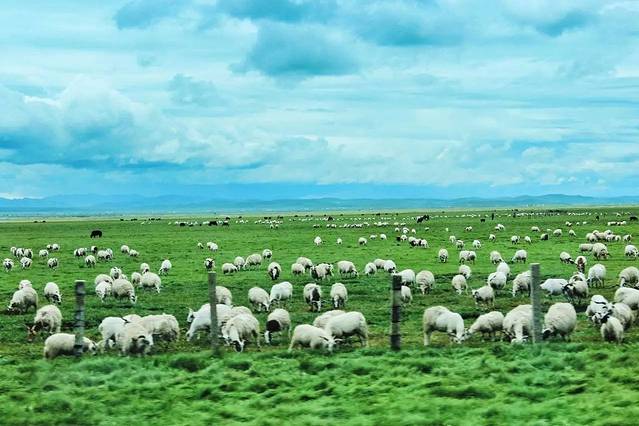 青青的草原上,成群成片的羊像是撒在海苔上的一粒粒白色芝麻,时而堆在一处,时而分散开去。偶尔车停是遇见蛮横抢路的牦牛,哒哒哒地迈着步伐穿过属于行车的道路去向另一边的草场。也有一两只会站在路边,不像是人在看它,倒像是它在看人。