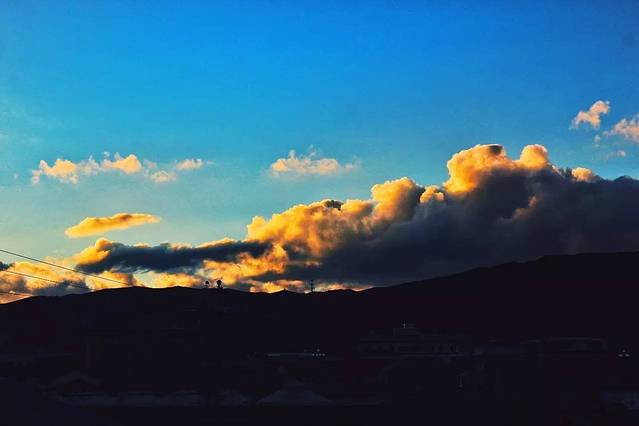 醒来天蓝已经天暗,云团像书里写的那样镶着 金边 ,散发出令人感到温暖的橘黄。远远的街头尽处晚霞带着羞涩的粉,是少女红润的脸颊,也是开在高原天空上的桃花。