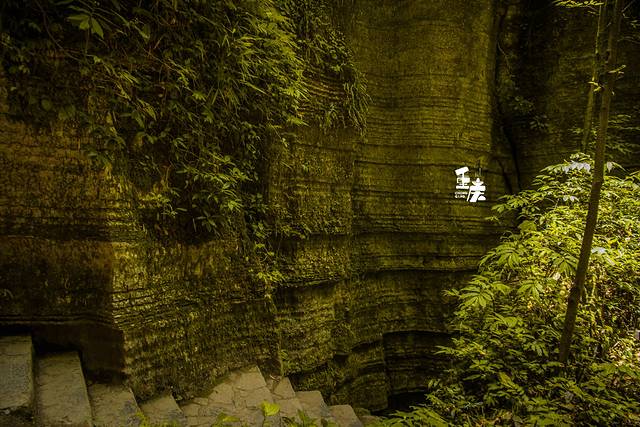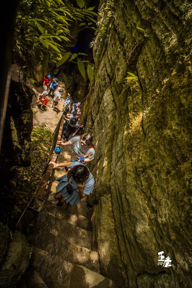 走到外面,道路变得狭窄,长长的台阶仅能容下一人,抬起头便看到耸立的山壁,狭长的天空,微弱的光线,让这里变成了一处安静的避暑胜地,走在下面好怕上面那块巨石突然掉下来,哈哈哈。