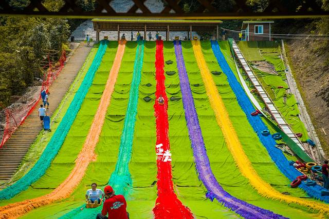 滑草区域垂直落差我目测应该在10-20米左右,整个滑道目测大概在50米左右。整个场地底面是绿色的帷布拉着,面上是几个被染成五颜六色的滑道,看起来像彩虹一般,被称为七彩流星滑道。体验者要先在底下拉着一个盆顺着楼梯往上爬,然后到顶后自己滑下来,这是一个自给自足的项目。