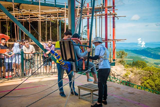 秋千的绳子长度不一,荡出去的距离也就不一样,一甩出去就是300米的高空,分为高和低不同的等级,有胆量的可以挑战一下最长的绳子哈。前面体验的无一人不尖叫,如果你在秋千上肆无忌惮的说一点也不怕,工作人员可是非常不厚道的狠狠推你一把。