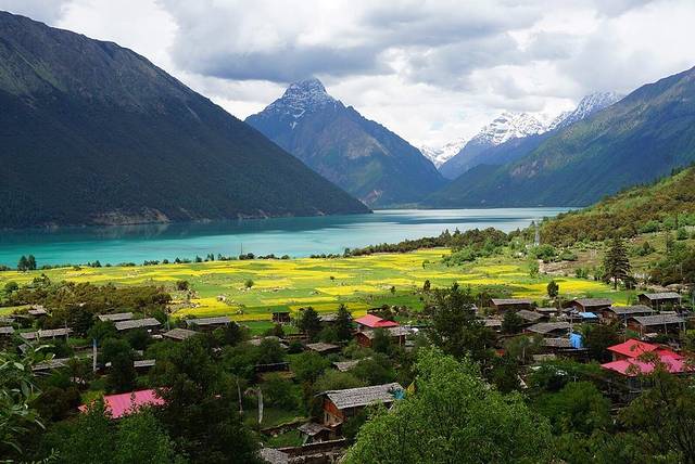 然乌湖被称为藏东第一大湖。湖边是绿草茵茵的草场,湖边的山腰上则是莽莽的森立,再加上山顶终年不化、连绵起伏的雪山,这景色简直不要太美。