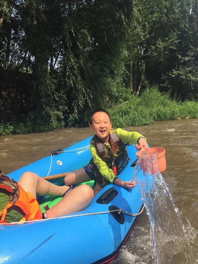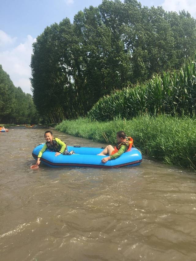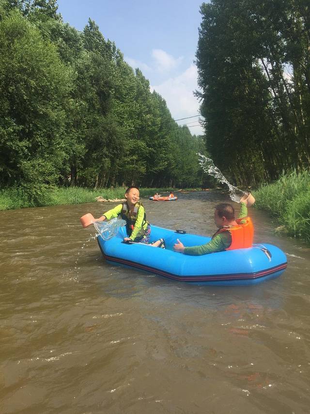周日,漂流的人不是很多,没有怎么排队,漂流过程中有2处很刺激的、坡度较大的地段,水都会溅到身上,灌到船里,超级爽的!还有几段水流较为急促的地方,小船随水流左右、前后旋转、漂动,心情荡漾!当然有一半都是较为平缓的路段,喜好热闹的可以用随船的木棍帮忙选择搁浅在河边,打打水仗,泼泼随行的人(水瓢景区提供);喜好安静的可以看看蓝蓝的天、两边绿绿的树、浑浊的河水。我儿子玩的非常开心,小外甥胆小,一路上都很小心的坐在漂流船上,直到快下船,表情才从木讷转变成欢快!在景区冲澡后,我们驱车前往今晚的入住地----道须沟景区下100米处的农家院(从黑里河到农家院行程约半小时)。