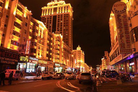 晚上的满洲里,也非常好,能看到绚丽的霓虹灯~高层上面也有霓虹灯,高高的建筑上也都有灯在闪烁,小湖旁的桥上面也有小灯。