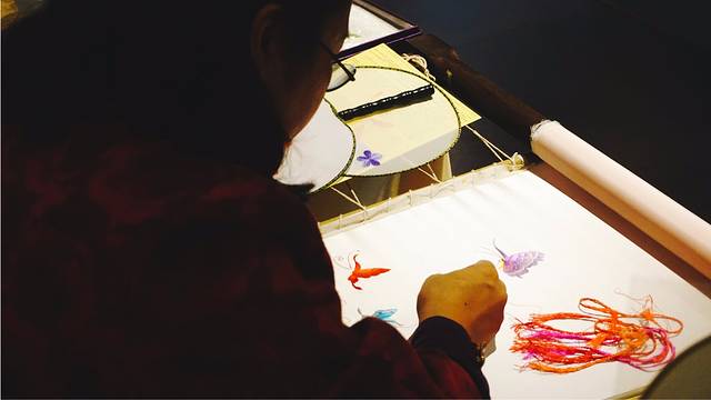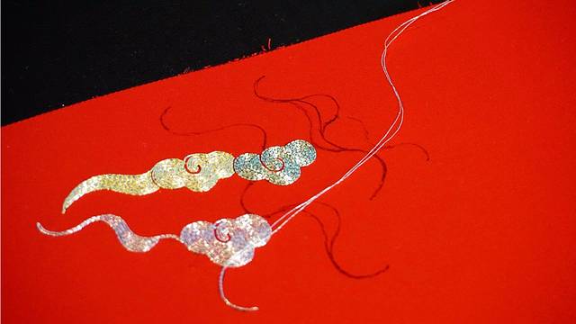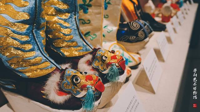 这是来自 贵州 的刺绣,其实和广绣风格差异挺大:一边是金银线,绘祥云图案;另一边多丝线,绘岭南风物。一个直接热烈,一个含蓄隽永。都好看。