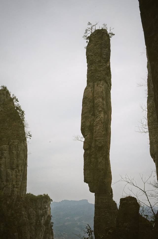 另一处别致的景观就是“玉笔峰”,也是那种直插云霄造型的岩石,没有“一炷香”看起来那么高,但也非常独特了。到了仲春时节,远处山间的油菜花盛开,背景呈现出一片金黄色,便形成一幅最好看的风景画。