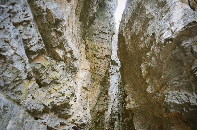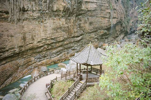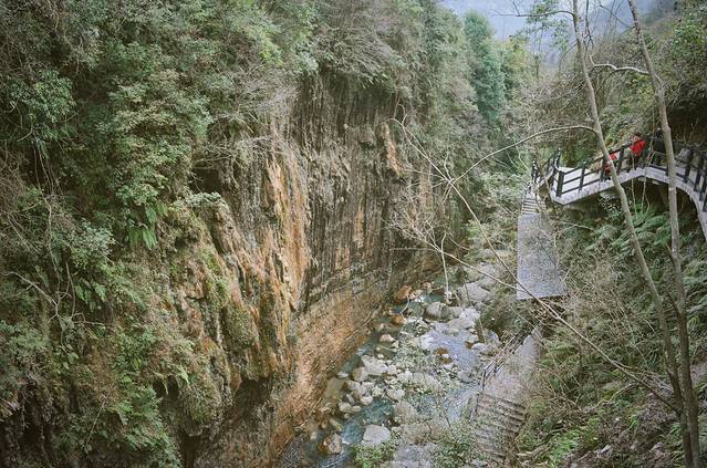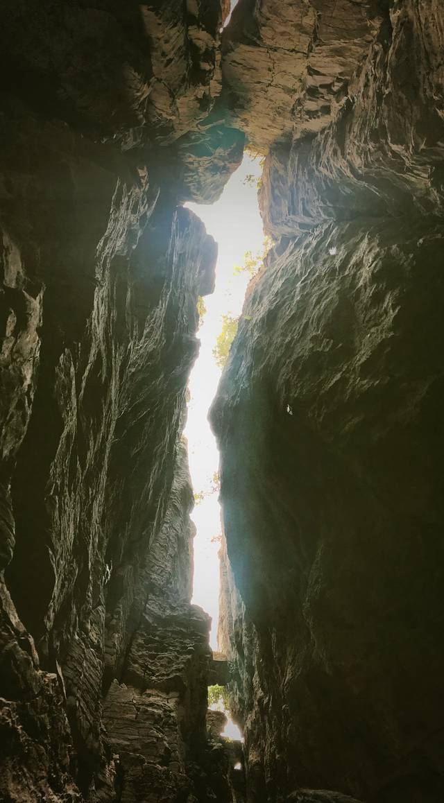 过了吊桥之后的路依据山势被人工开凿成了一条“晴雨长廊”,因为山体间有水流冲刷会有水滴落下,而外面明明是晴天还能看到阳光,所以有些东边日出西边雨的感觉。