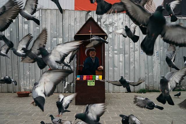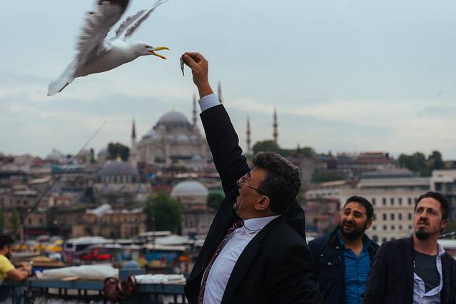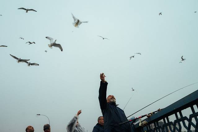 ▲在 伊斯坦布尔 最后一天加拉塔大桥上一个老人的口哨吸引了我,我在桥的人行道另一头,看到他手里拿着一个小鱼苗呼唤着海鸥,我想都没想拿起照相机短短的不到两秒钟,条件反射的把焦段拧到200mm,随便搓了一下快门速度,没来得及构图,就拍下了决定性的瞬间,当我横穿过汽车飞驰的大桥老人已经不见踪影只剩这一张照片给我的整个旅途画上了一个圆满的句号。