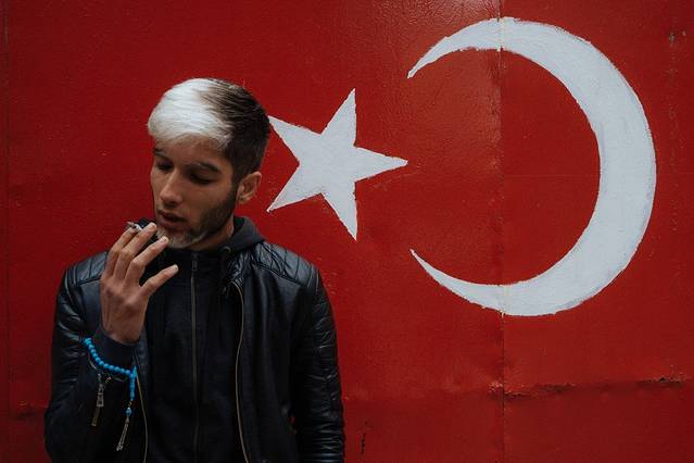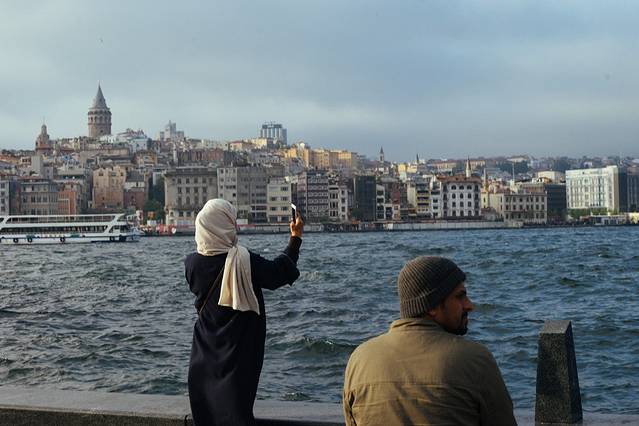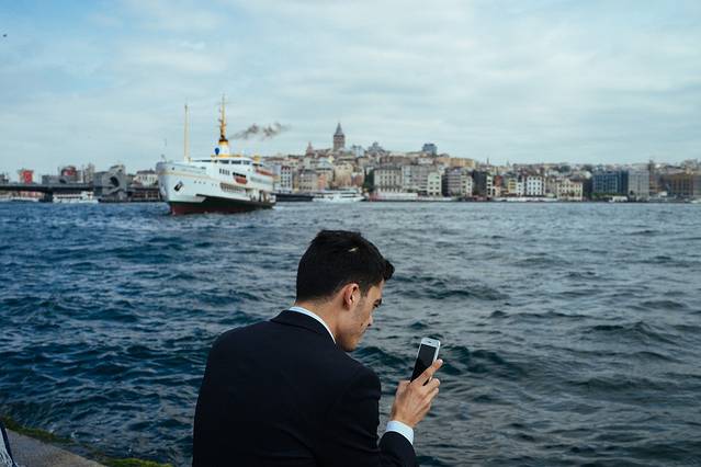 ▲在博斯普鲁斯海峡边上玩手机的 土耳其 青年