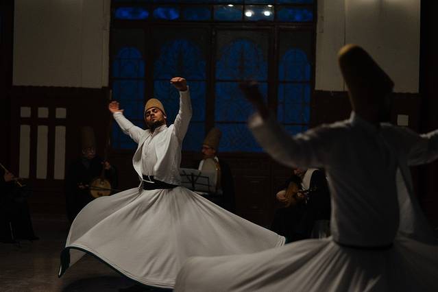一般先由一位长老带领一群舞者入场,敬礼后脱去外袍,便开始旋转,右手向上,表示接受神的赐福及接收从他而来的能量;头向右侧,表示没有了自我,及完全接受神的安排;左手向下半垂,手掌向下,表示将神所赐的能量传于大地及其它人民,广播于世间。他们不停地转,直至转至头晕脑胀,他们认为在自己半昏迷时,便是与神最接近的时间。