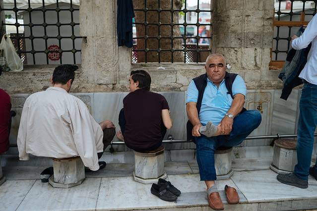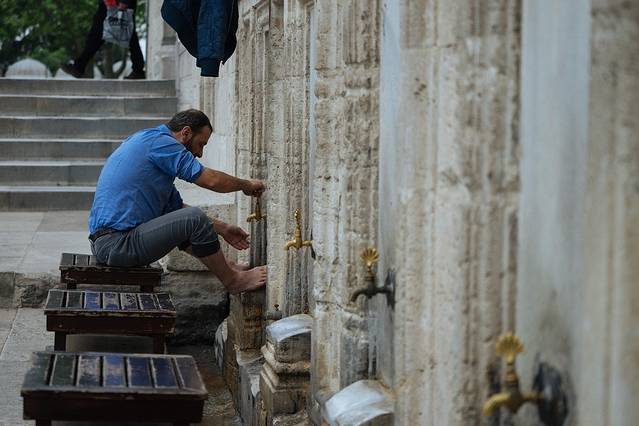 因为清真寺都是要脱鞋才能进去的,所以在进清真寺之前,是要洗脚和洗手的,鞋子套上门口的塑料袋放在里面的鞋架上,很多人还从垃圾箱里拿别人用过的塑料袋用,这一点真的挺让人敬佩的