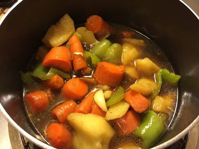 早晨起来第一件事,就是跑去前台要了一个锅,先给自己做一顿好吃的。茄子面、荷包蛋、炖菜。再次感叹,美国公寓的刀都好钝,土豆和胡萝卜都改用削和夯。