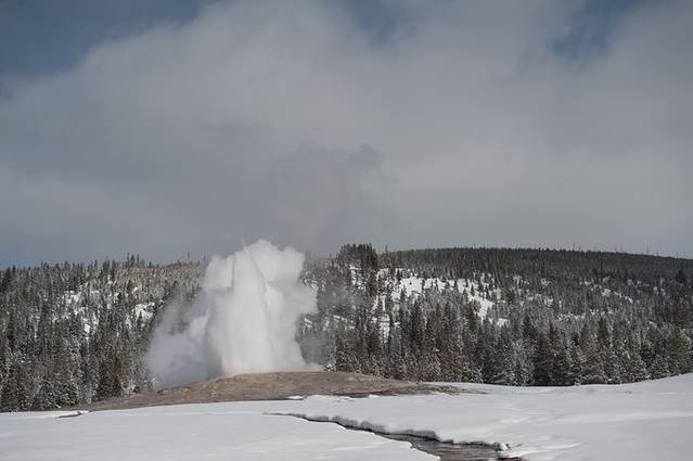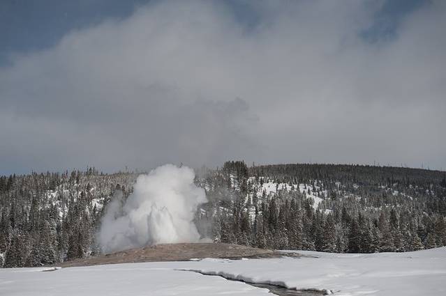 就在我们的手已经冻僵,这个老忠诚终于喷发啦。或许在冬季水雾效果增加了他的魅力,个人感觉还是挺壮观的。滚烫的热水喷到空中,很快被冷却,形成了冰晶,飘散开来。
